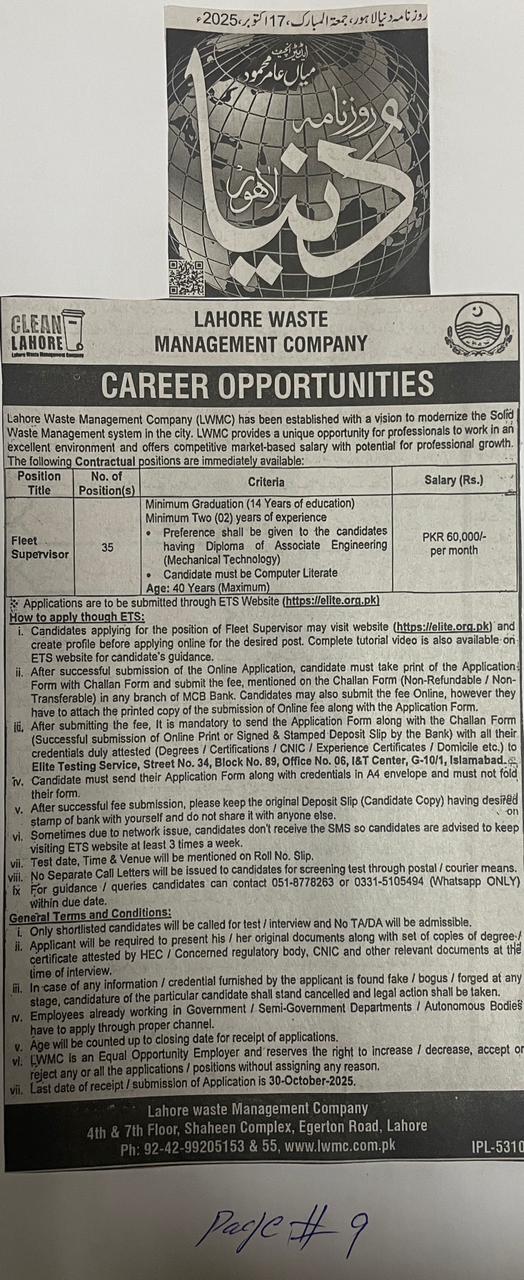Elite Testing Services (ETS) is conducting the recruitment process on behalf of Lahore Waste Management Company (LWMC) for the following contractual position. LWMC is a public sector organization working to modernize solid waste management in Lahore and offers excellent career growth opportunities.